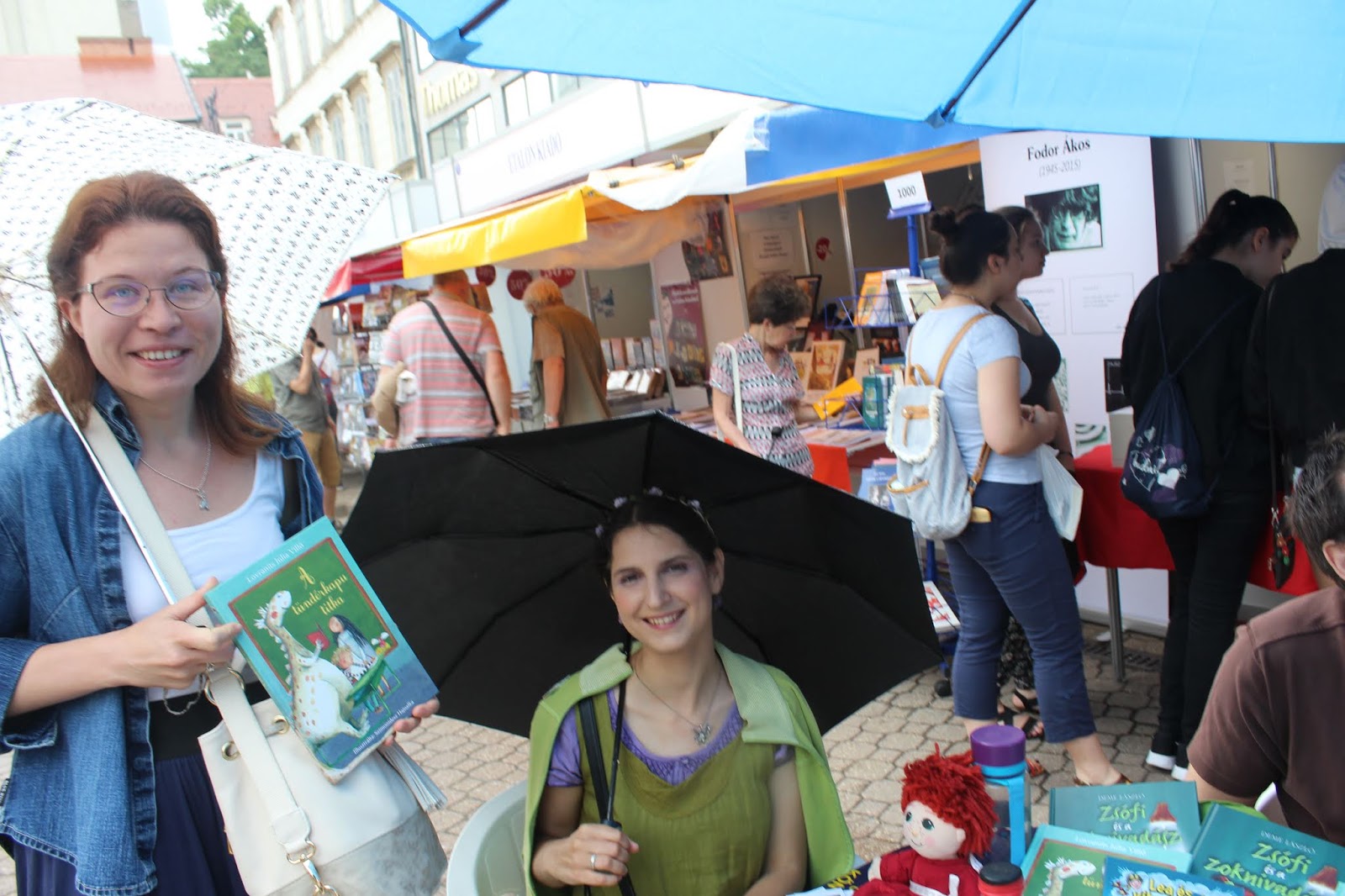Aligha én vagyok az egyetlen, akit a könyvheti monszun első blikkre elkedvetlenített. A reggeli nagy zuhé után lézengő emberek, hullámosra vizesedett könyvek, kitartóan csepegő eső. Nem volt biztató látvány na. Pedig napok óta készültem a Könyvhétre: arra gondoltam, mi lenne, ha nem csak úgy üldögélnék ott, mint az egyszeri írónéni, hanem vinnék néhány játékot mindenféle korosztálynak. És ha már a legújabb mesekönyvem tündéres témájúra sikeredett, akkor legyen igazi "tündérpróba": tündéres, kincskereső ügyességi játékok gyerekeknek, és napi szerencsetündér kereső felnőtteknek.